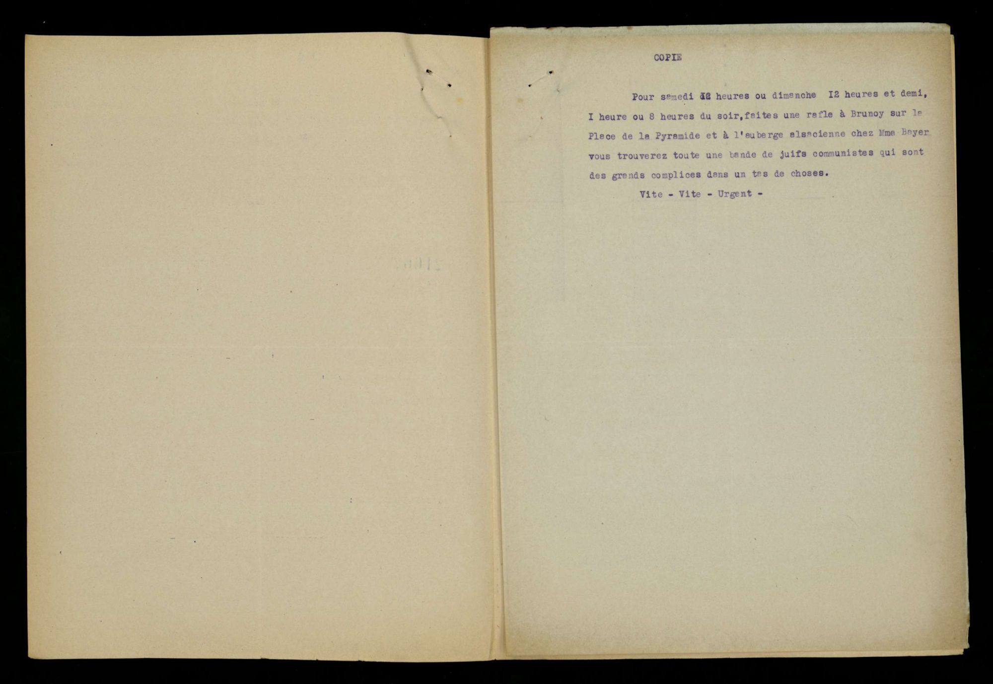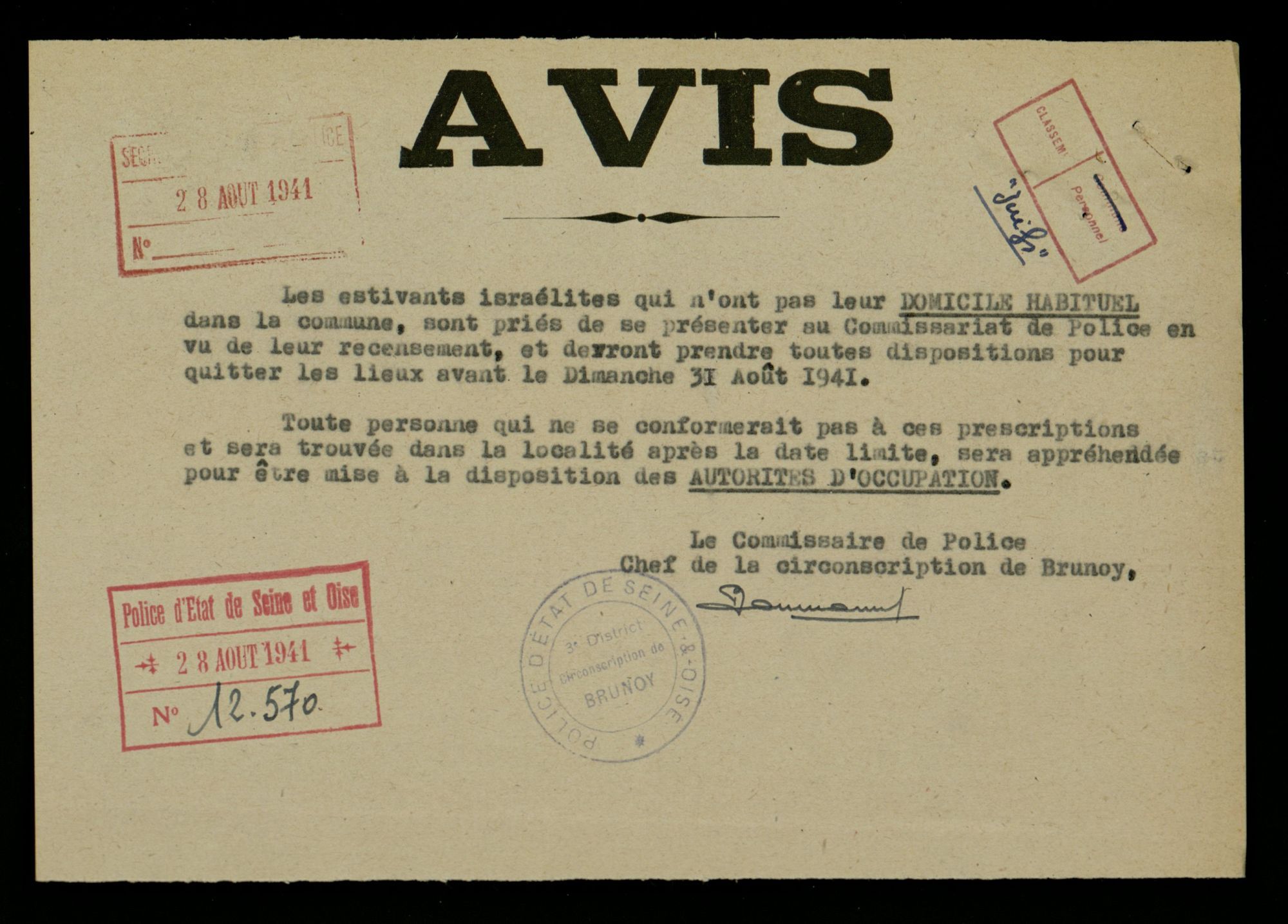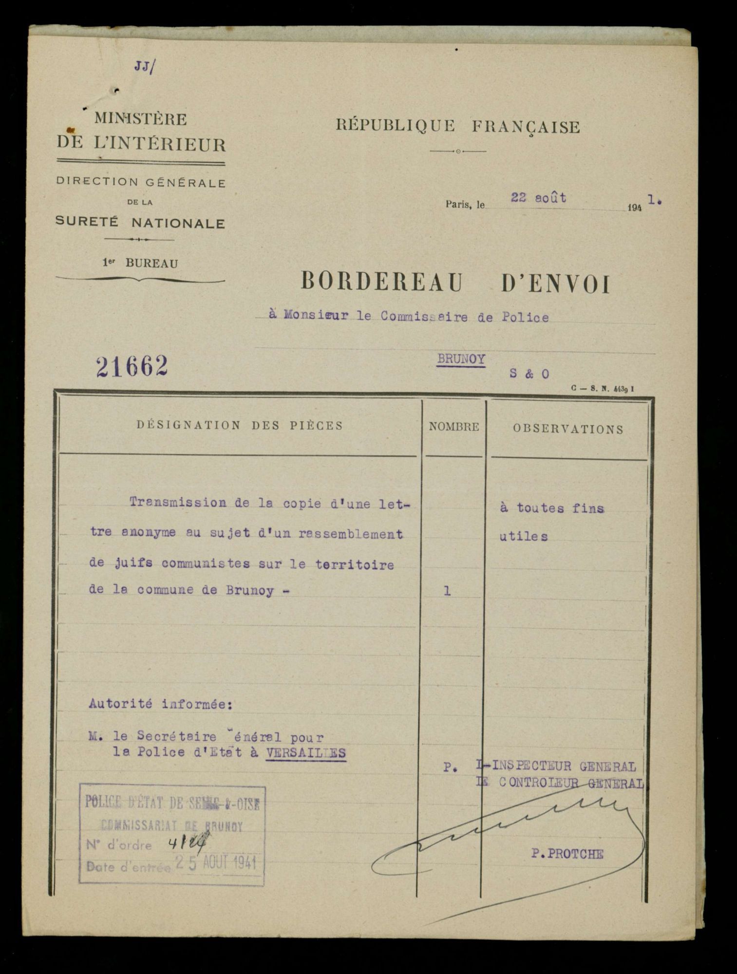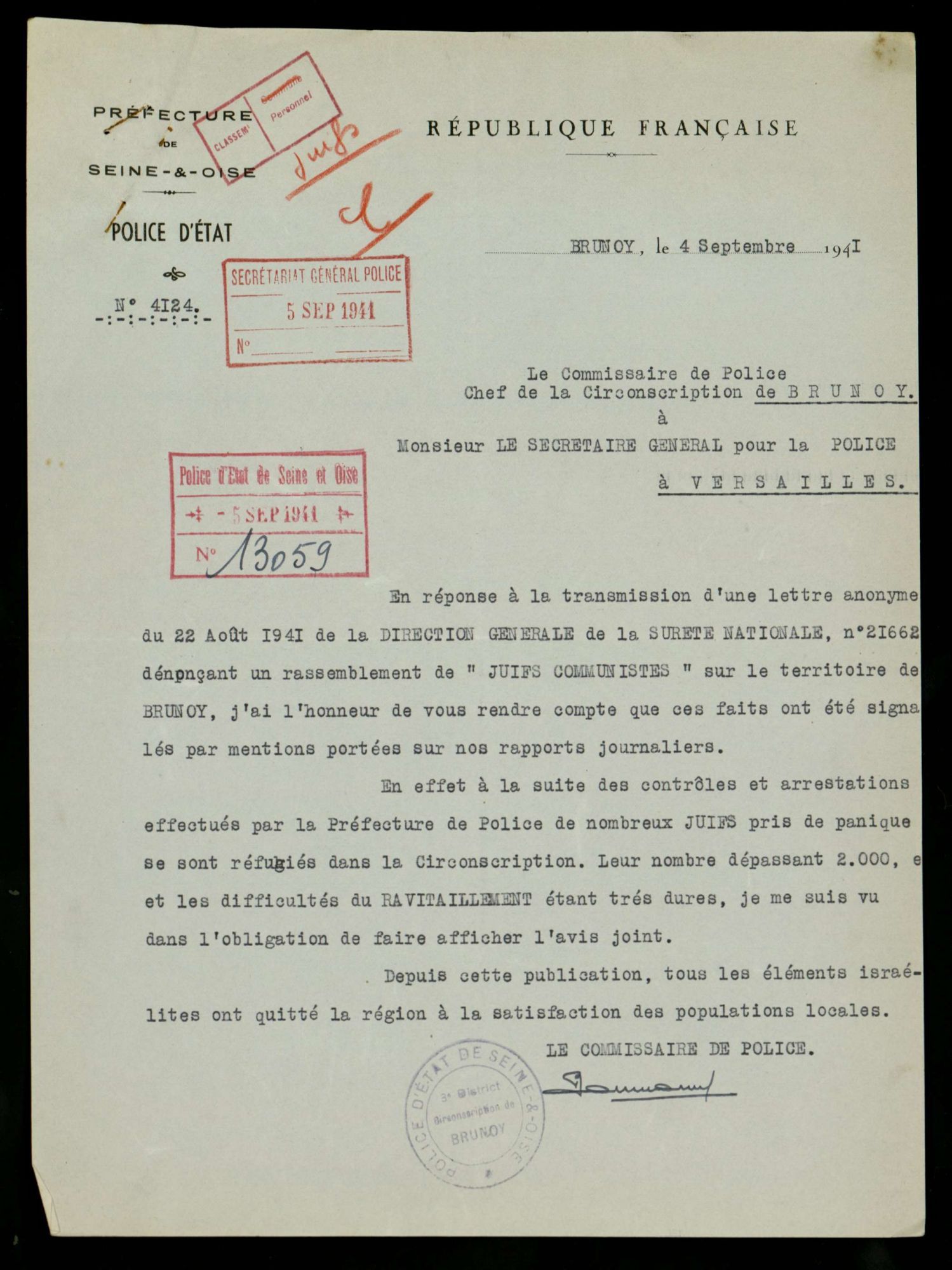 Dénonciations : l'exemple de la commune de Brunoy En août 1941, la police française est informée par une lettre de dénonciation anonyme que de nombreux juifs résident illégalement sur la commune de Brunoy. Des mesures sont alors prises très rapidement.