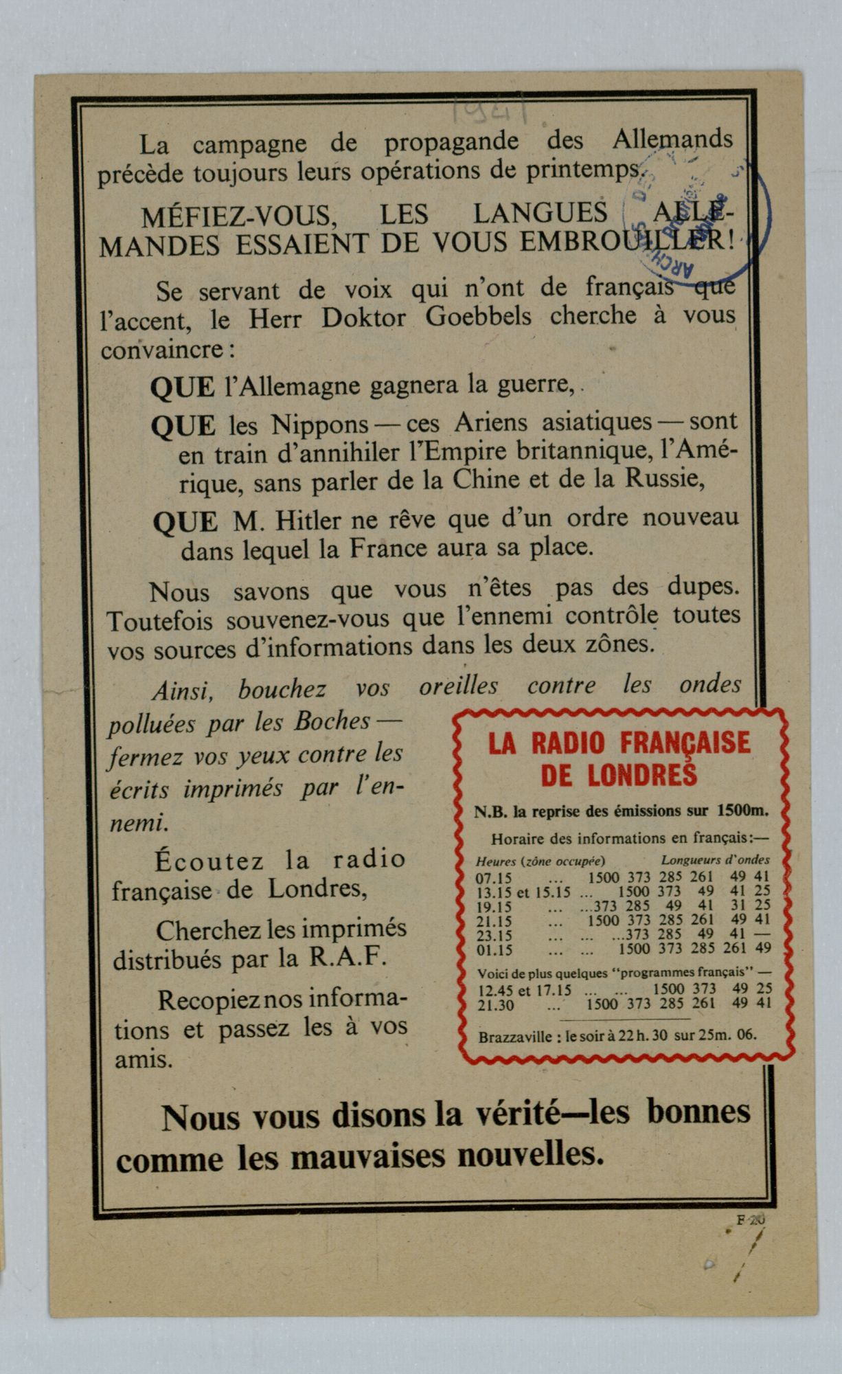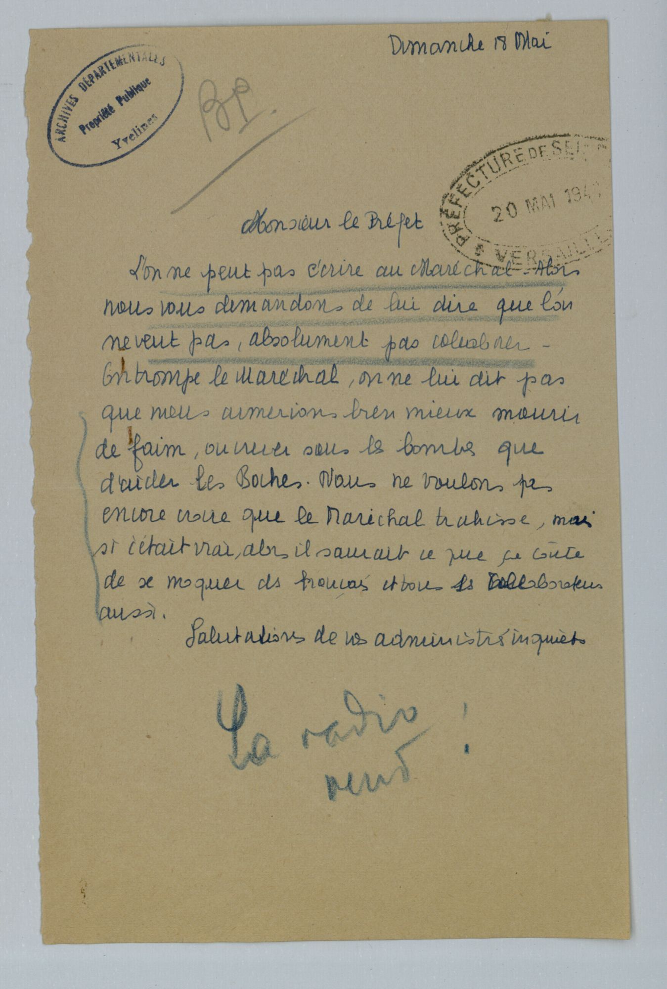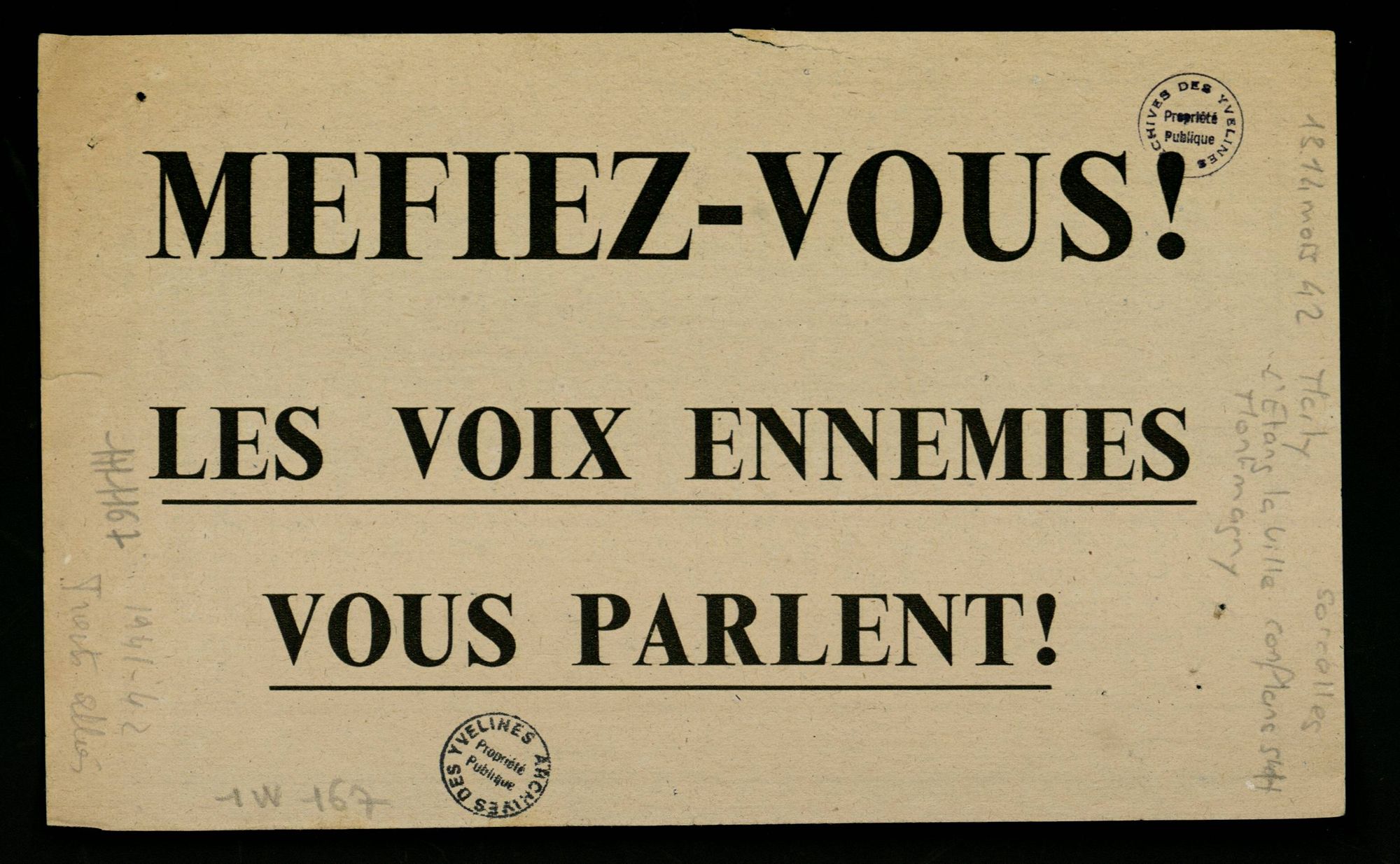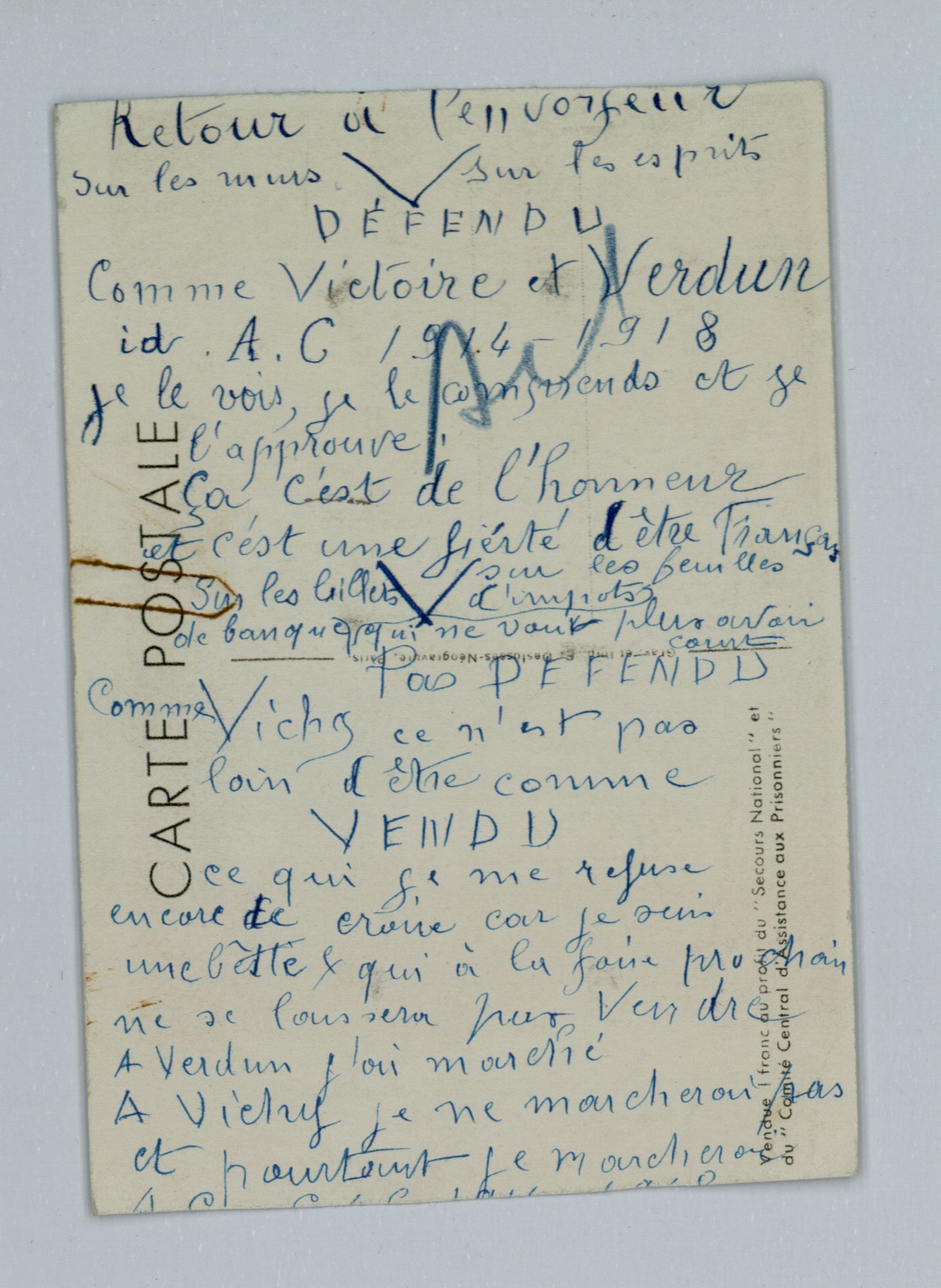 Initiatives individuelles et tracts non identifiés Ensemble de documents de mouvances non identifiées qui présentent des actes de résistance sans doute sporadique. Les diapositives 3, 4 et 5 montrent la remise en cause de la figure du vainqueur de Verdun. Voir aussi Déportation et politique antisémite sous l'occupation Visite Résistance et déportation en Seine-et-Oise Concours National de la Résistance et de la Déportation Projet "Convoi 77" La Résistance en Seine-et-Oise Réseaux, le jeu sur la Résistance