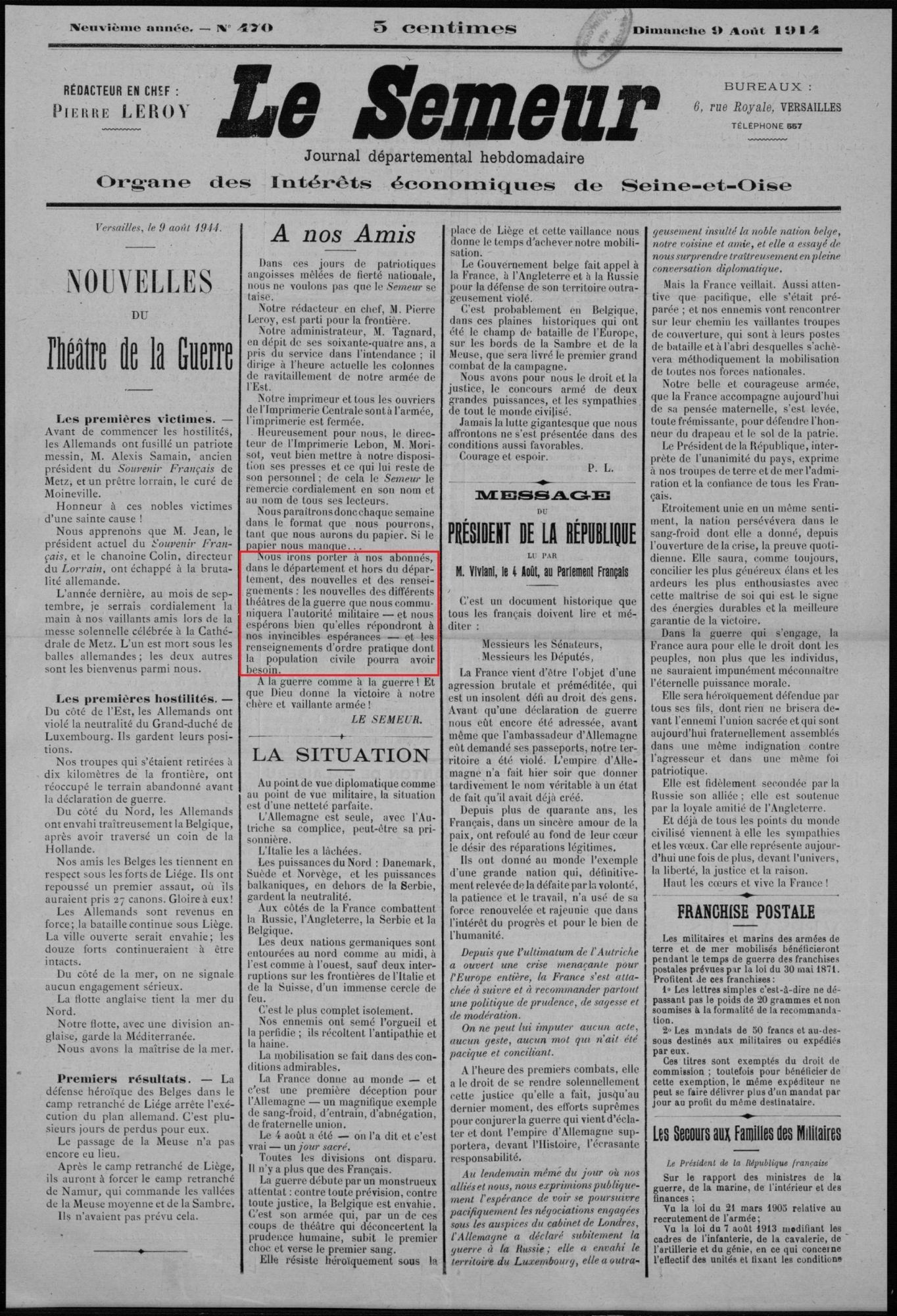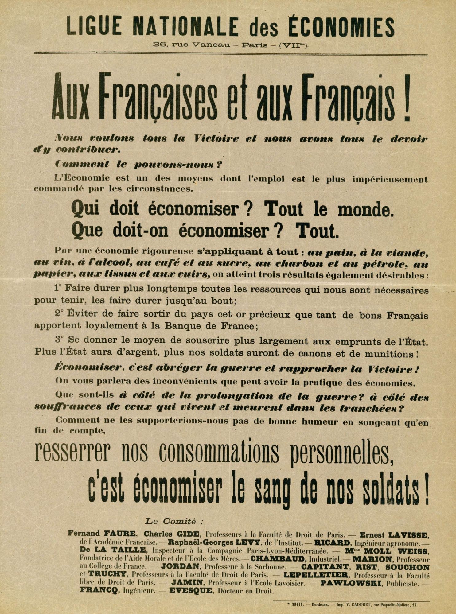 A l’arrière, la production agricole est particulièrement touchée par le départ des travailleurs et chute de 30 à 50 %. Le gouvernement est obligé de rationner le pain, le sucre, les pommes de terre… La production industrielle baisse aussi, or l’armée a besoin du charbon et de l’acier. L’État appelle toute la population à économiser.