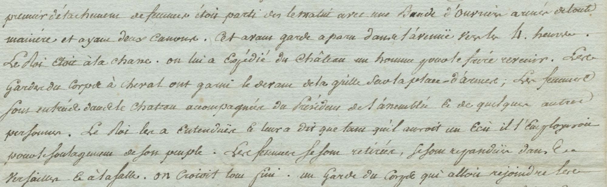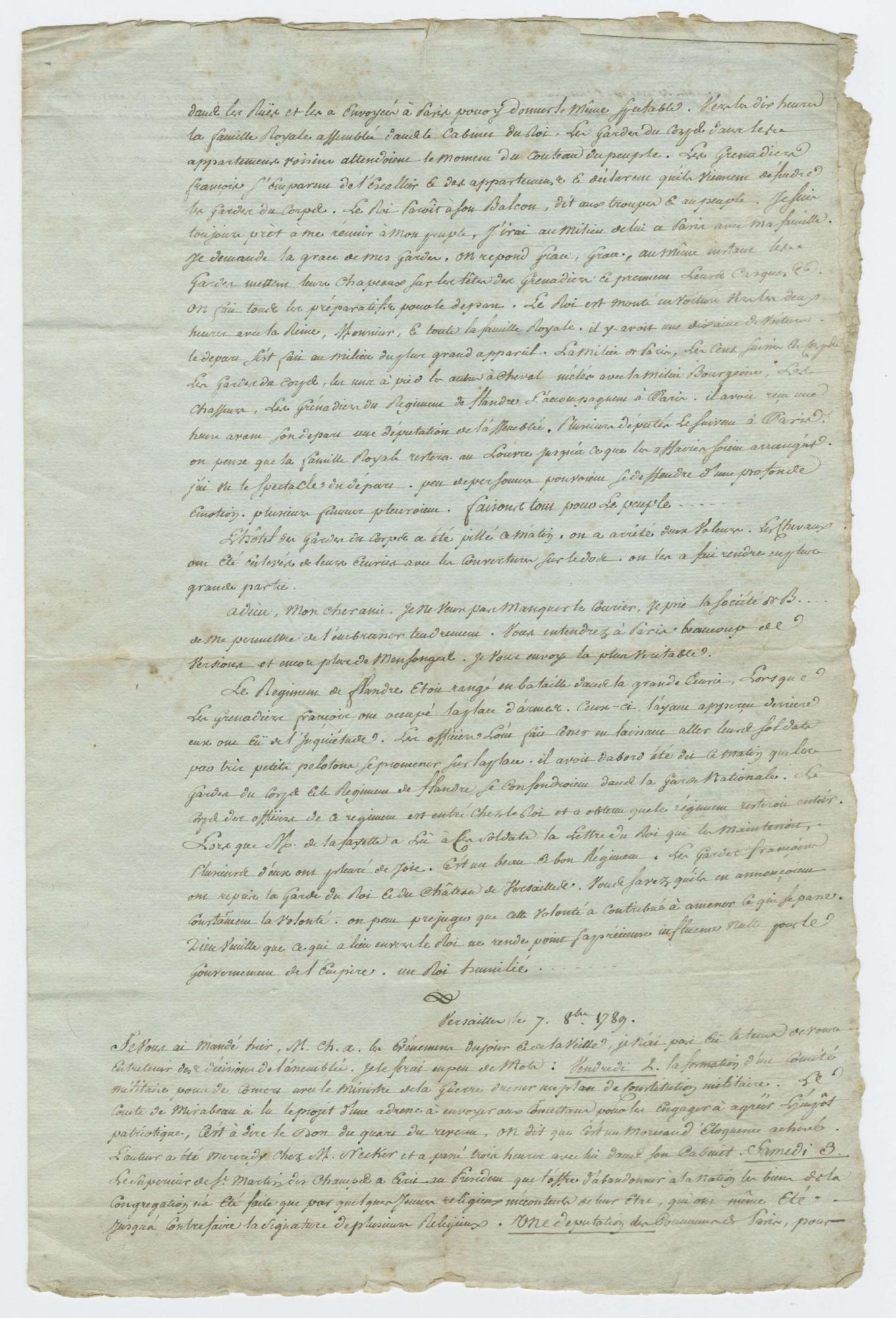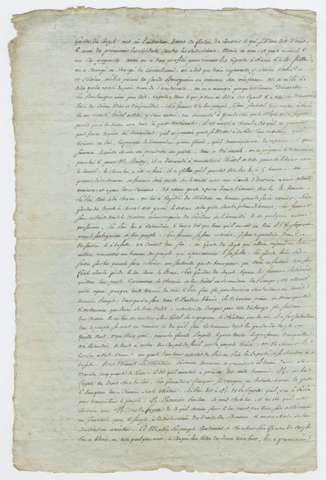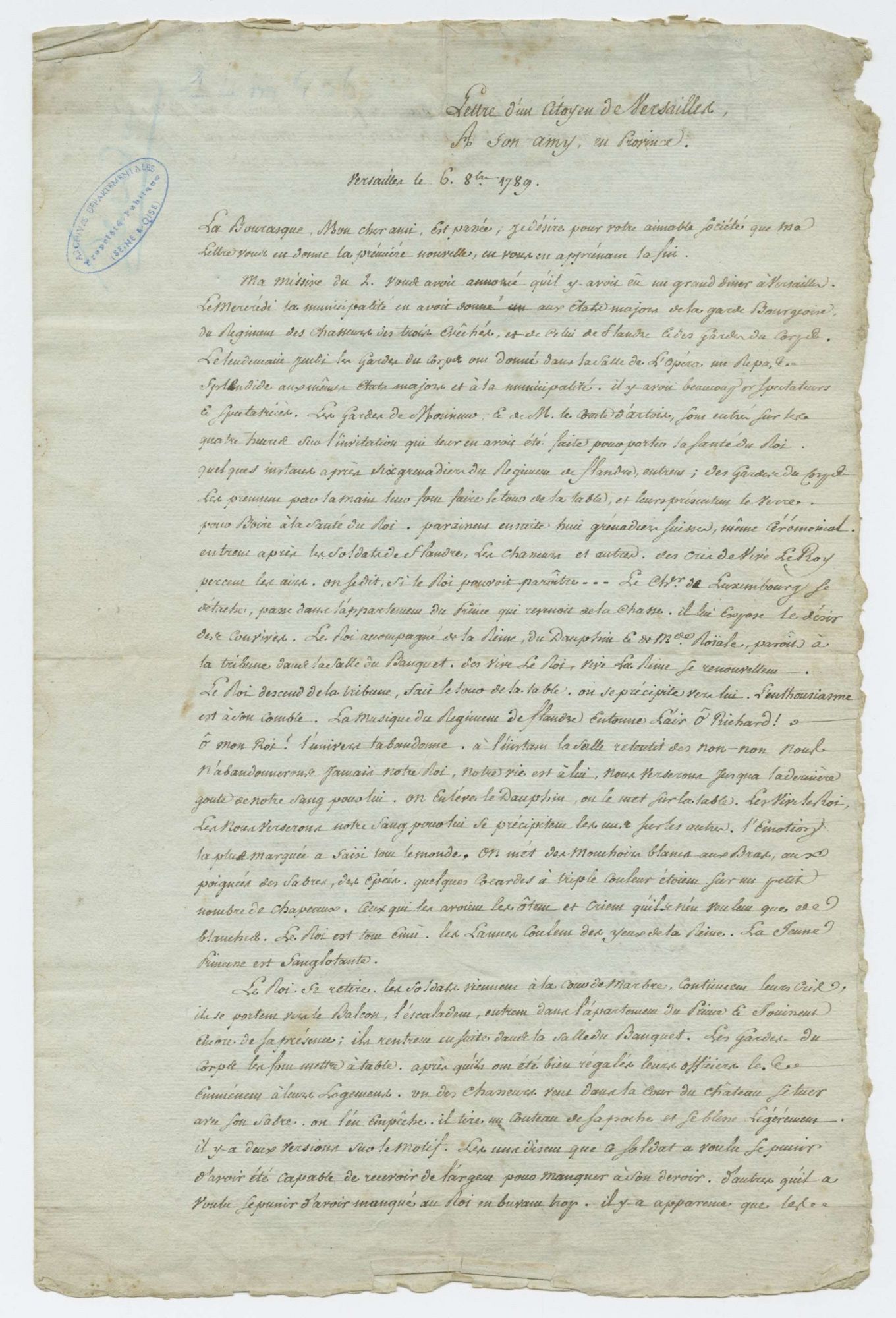 Cette ressource propose d’étudier les journées des 5 et 6 octobre 1789 à partir d’un document unique, une lettre écrite par un Versaillais à un ami de province (ADY - 1L406). On n’en sait pas plus sur l’identité de l’auteur ou du destinataire. Longue de 4 pages, elle reprend par le détail les évènements qui ont précipité le retour de la famille royale à Paris, ainsi que l’acceptation par Louis XVI des premiers articles de la constitution et des décrets du 4 août. Elle met également en évidence comment circulent l’information et la rumeur dans les premiers mois de la Révolution.
