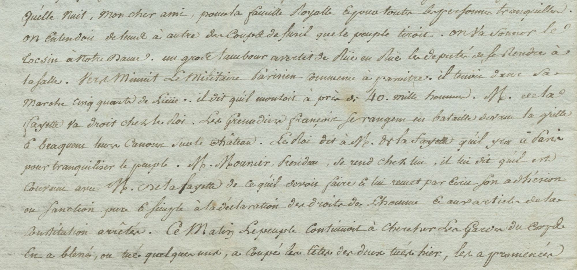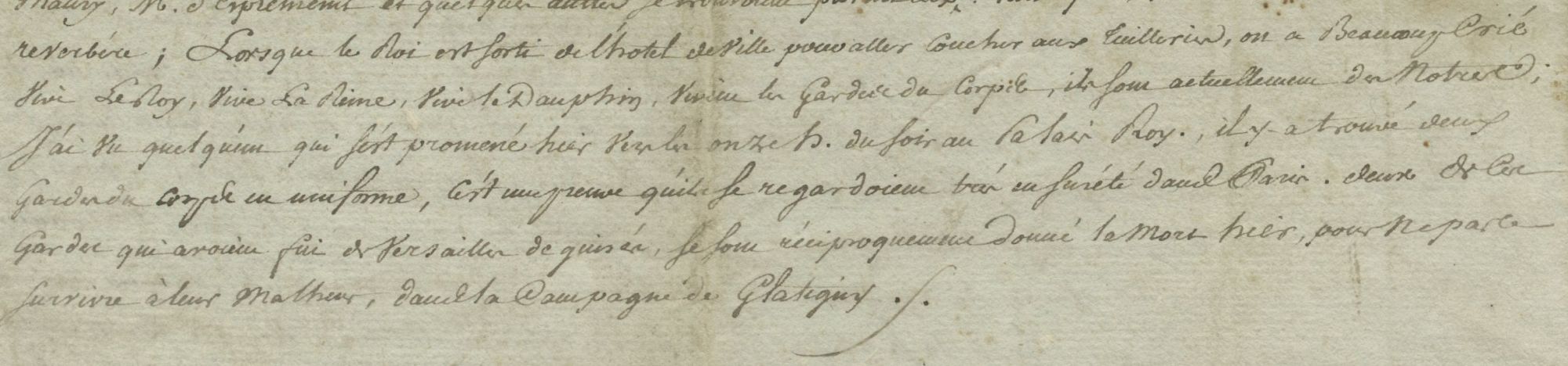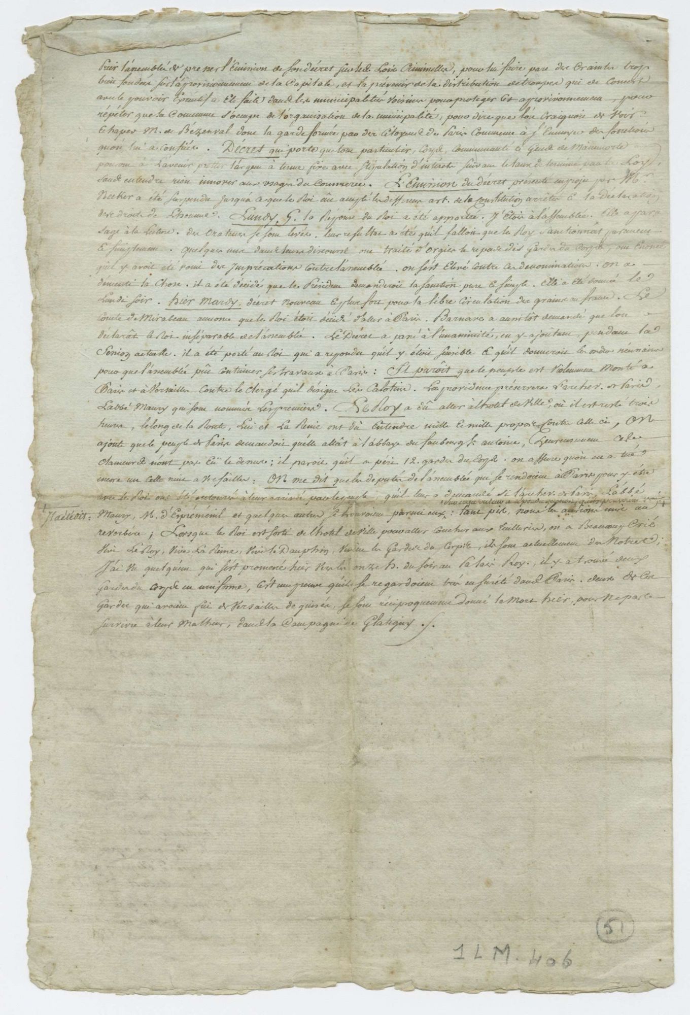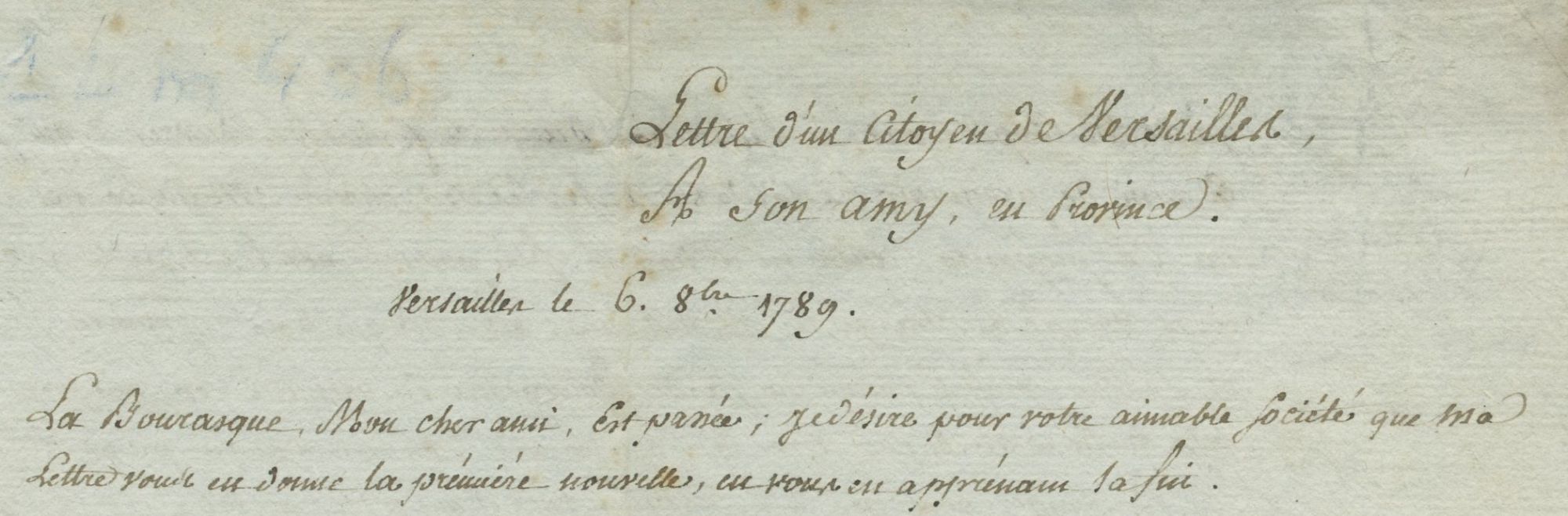 Cette ressource propose d’étudier les journées des 5 et 6 octobre 1789 à partir d’un document unique, une lettre écrite par un Versaillais à un ami de province (ADY - 1L406). On n’en sait pas plus sur l’identité de l’auteur ou du destinataire. Longue de 4 pages, elle reprend par le détail les évènements qui ont précipité le retour de la famille royale à Paris, ainsi que l’acceptation par Louis XVI des premiers articles de la constitution et des décrets du 4 août. Elle met également en évidence comment circulent l’information et la rumeur dans les premiers mois de la Révolution.