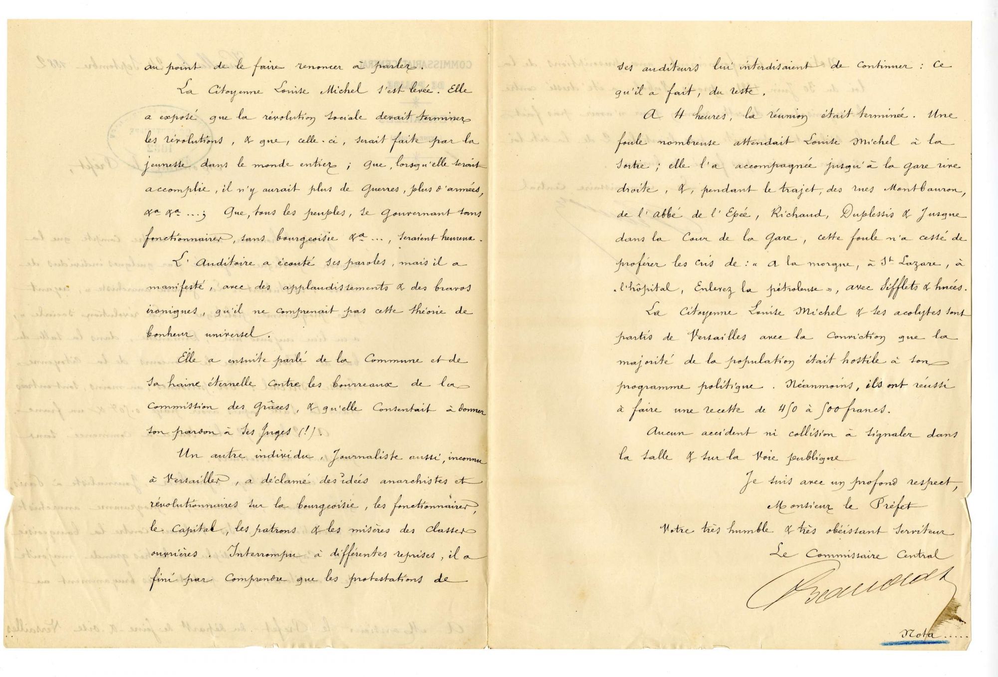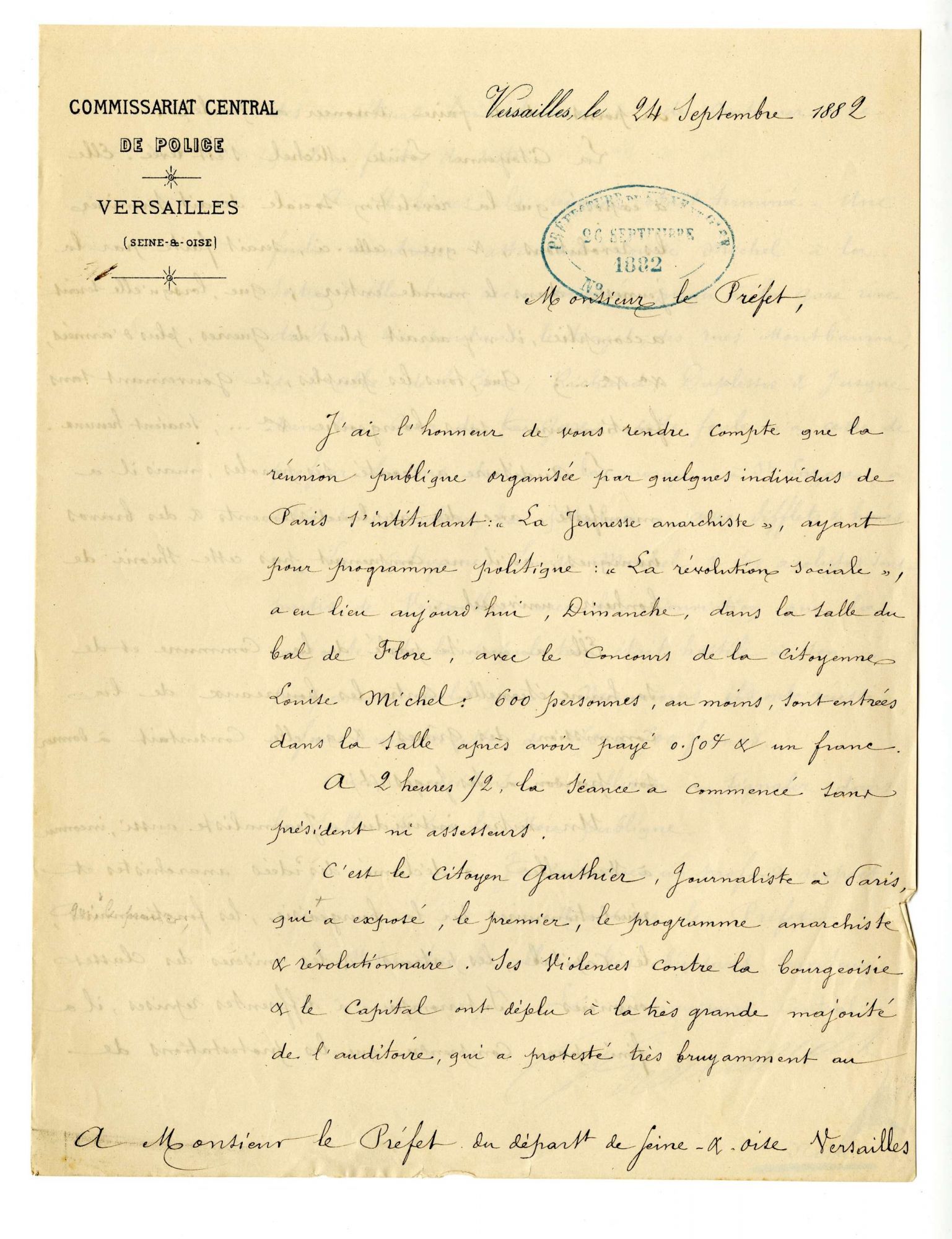 Les Archives départementales des Yvelines conservent un rapport de police en date du 24 septembre 1882 qui rend compte du Grand Meeting organisé par la Jeunesse Anarchiste à Versailles avec le concours de la citoyenne Louise Michel. Ce document permet d’aborder à la fois le projet politique anarchiste et comment celui-ci est perçu par une partie de l’opinion publique. Il a l’avantage de montrer que les idées défendues lors de la Commune ne se sont pas éteintes avec la répression.