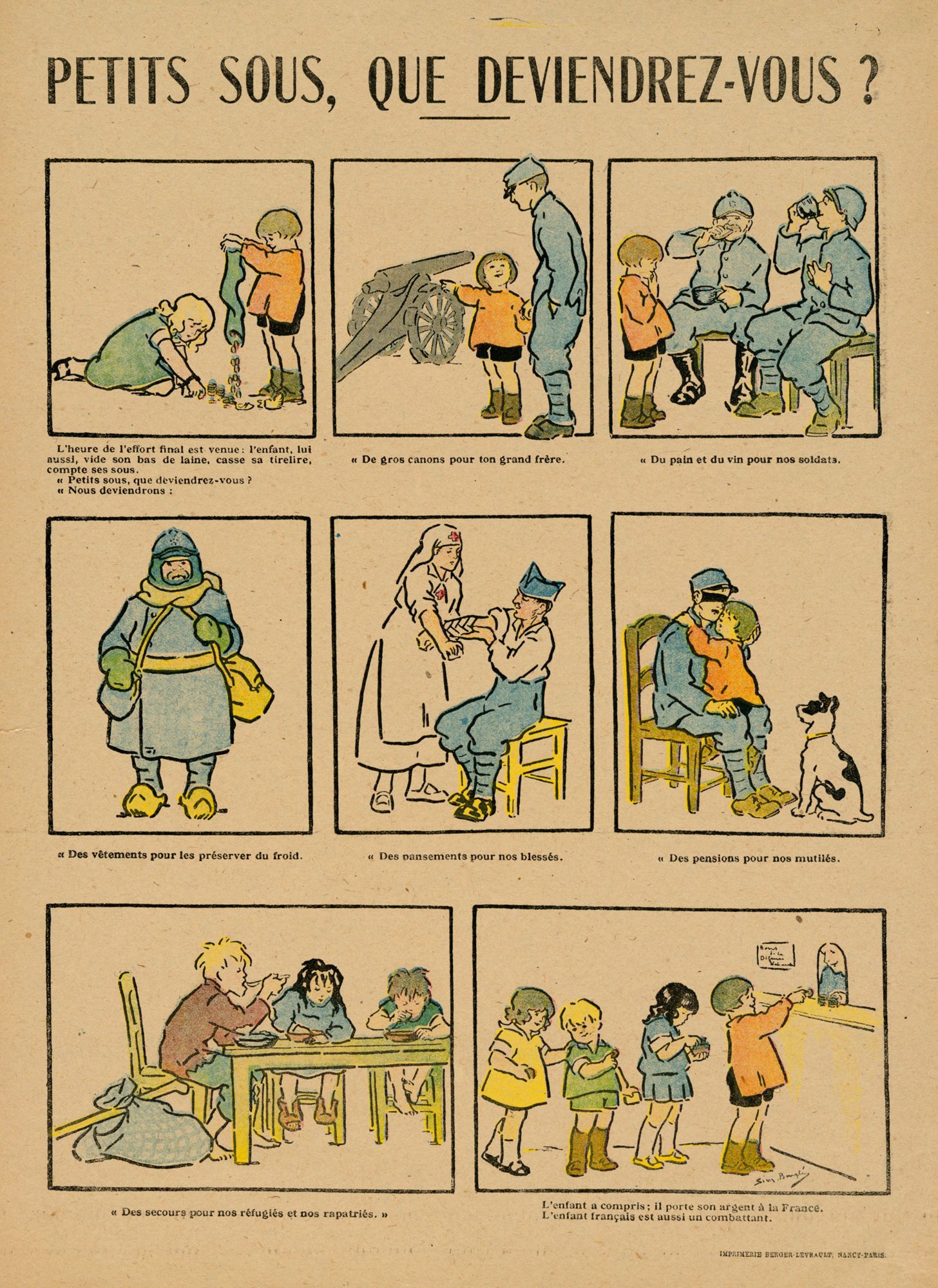 A partir de reproductions grandeur nature de documents conservés aux Archives (affiches, avis à la population, extraits de presse), les élèves travaillent en groupe et découvrent les conditions de vie d'une famille à l'arrière : le rationnement, la propagande, l'éducation, la contribution à l'effort de guerre, le réconfort des soldats au front.
