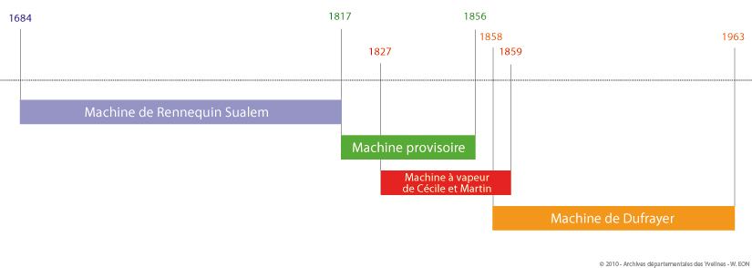La construction de la machine de Marly est le projet hydraulique le plus ambitieux du XVIIè siècle, manifestant ainsi d’une réussite technologique à la hauteur du prestige royal de Louis XIV. Il s’agit de faire gravir à l’eau de la Seine une dénivellation de 126 mètres, jusqu’en haut de la colline de Louveciennes. De là, par gravité, l’enjeu consiste à la guider vers des réservoirs de stockage proches du château de Marly et d'alimenter les bassins de Versailles. Le financier Arnold de Ville et le maître charpentier Rennequin Sualem s’inspirent des techniques minières et métallurgiques pour inventer un outil gigantesque dont le travail se répartit sur trois niveaux. Dans le même temps, Vauban entreprend des travaux importants de maçonnerie et de renforcement des berges pour accroître le débit du fleuve. Dès 1685, l’usage de la machine est presque entièrement réservé au château de Marly.