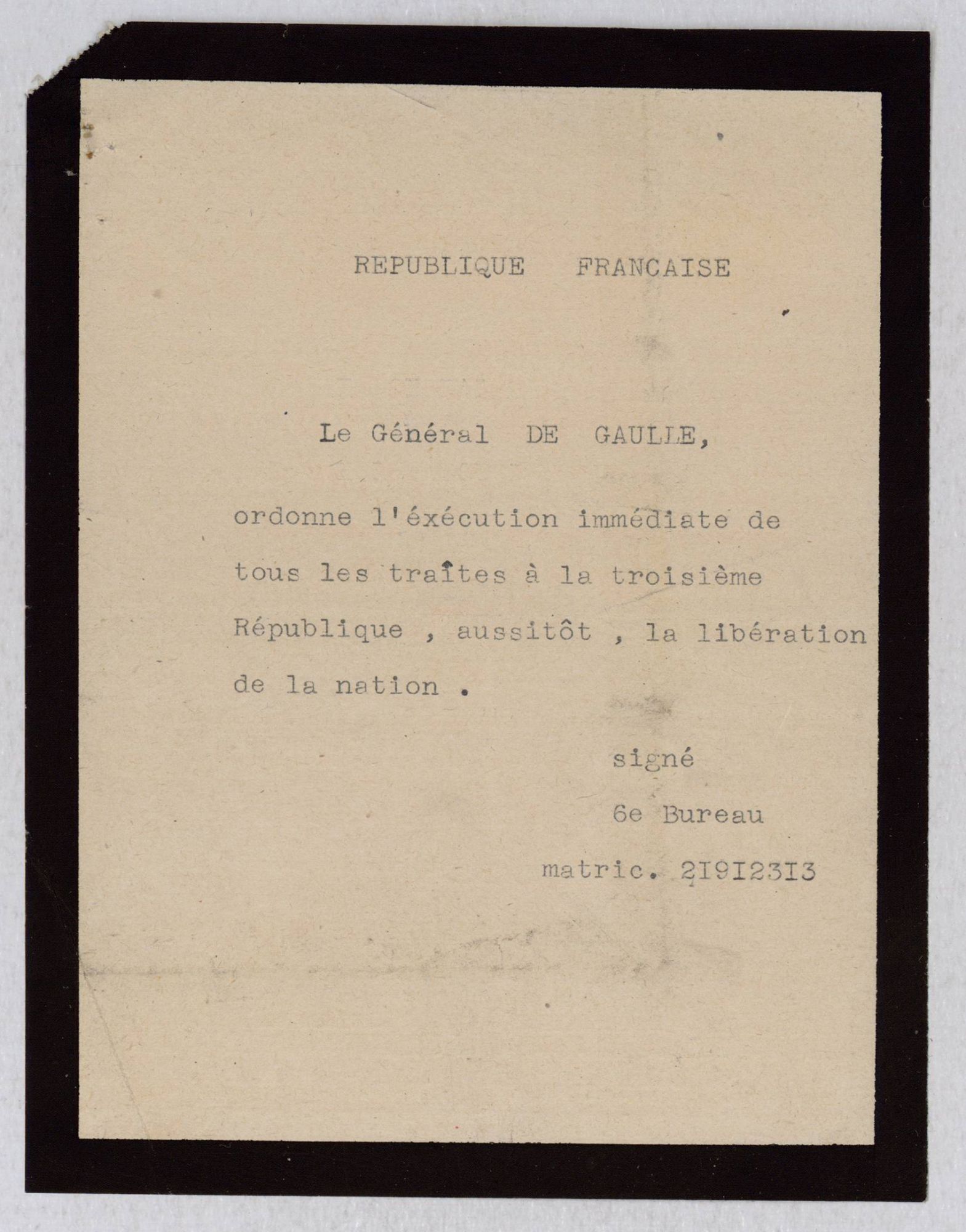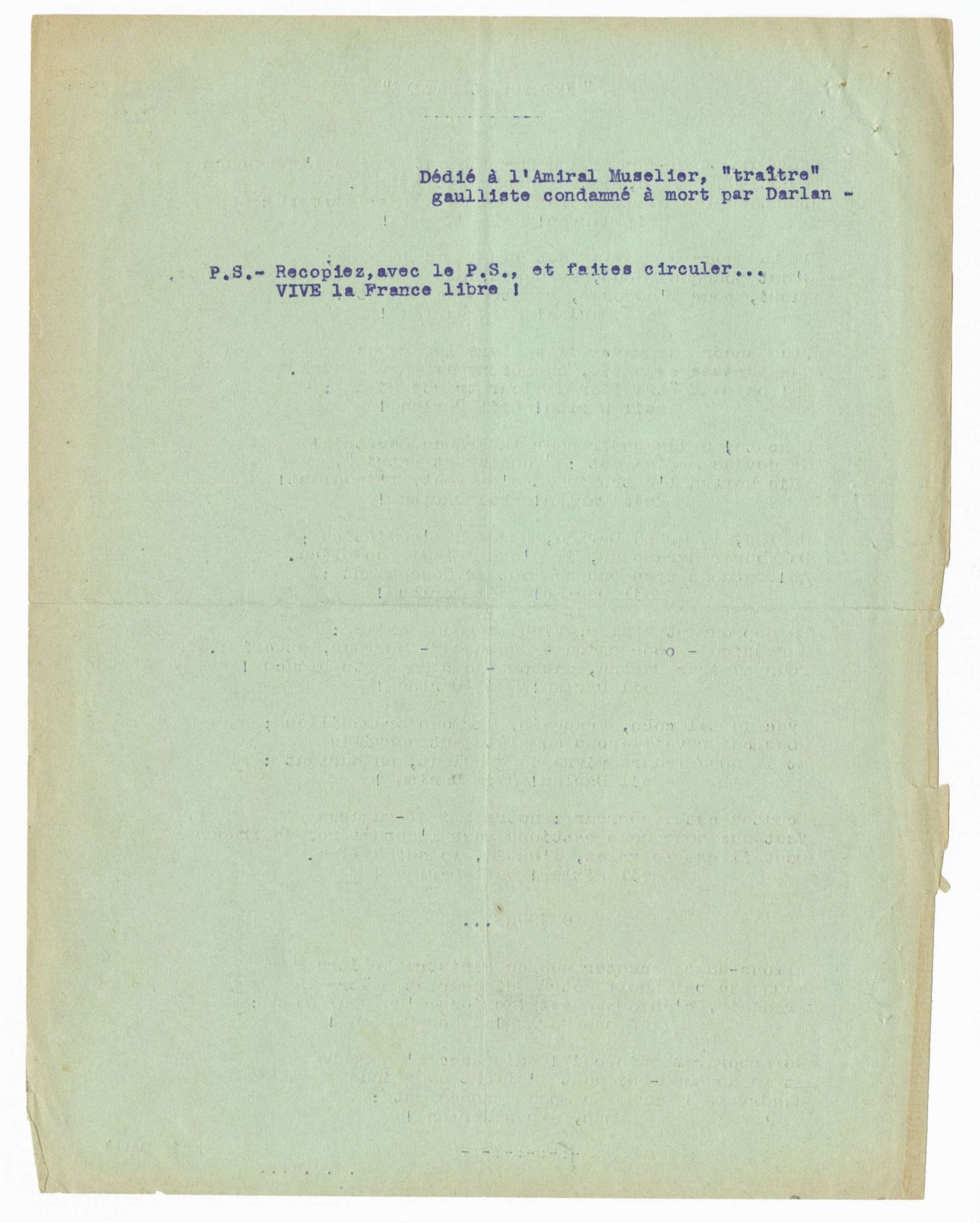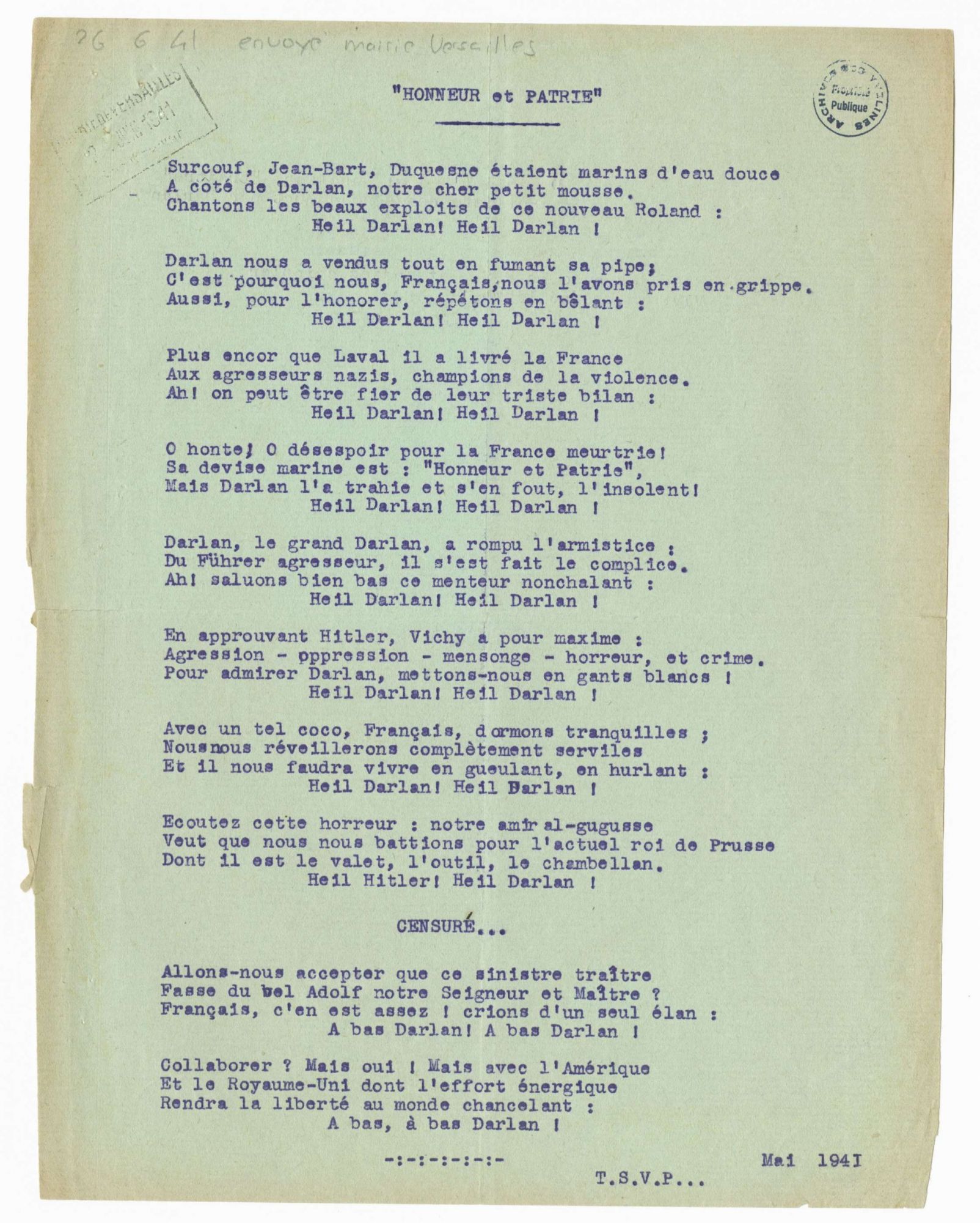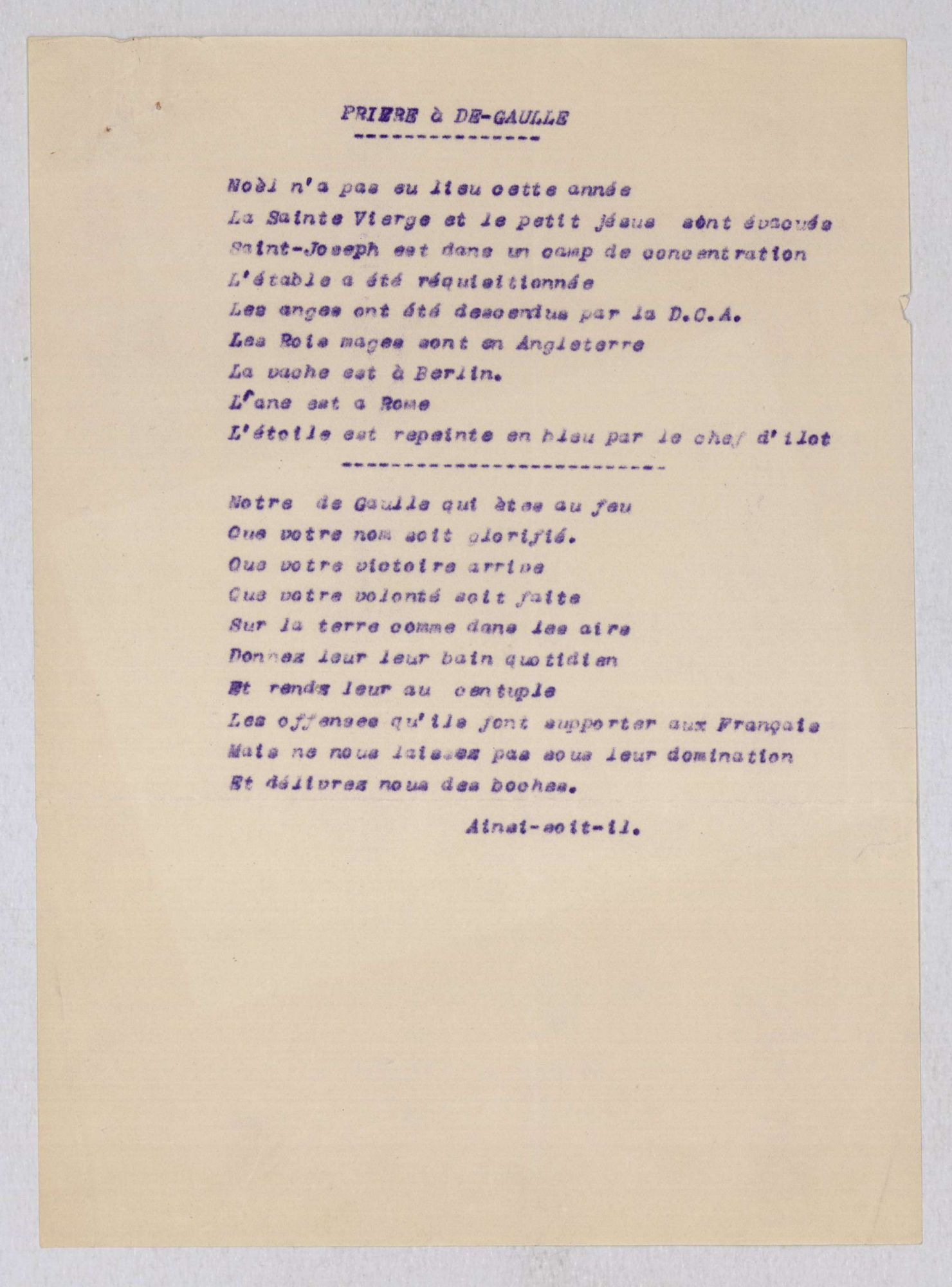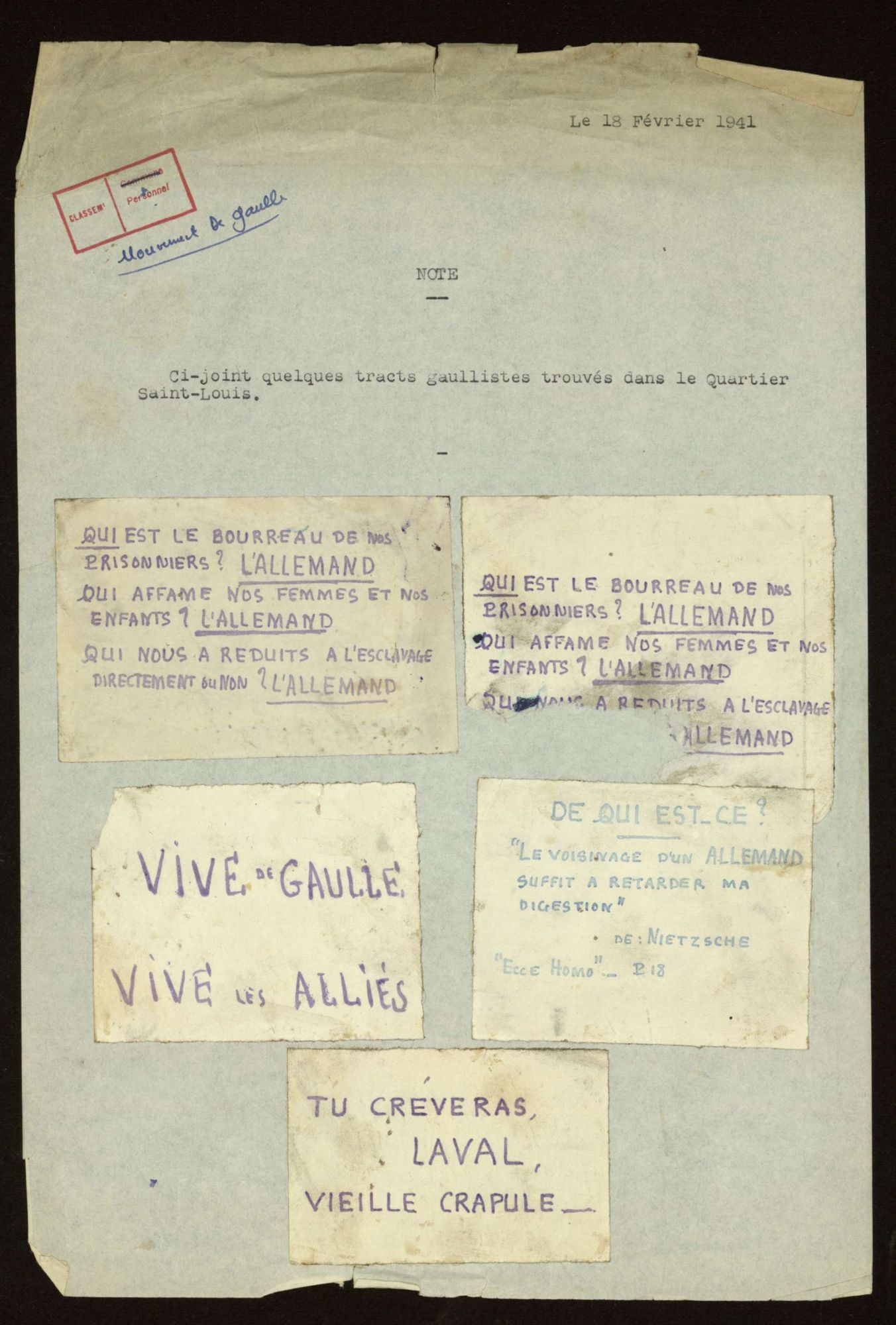 Le nombre et la diversité des tracts gaullistes permettent d’avoir un aperçu des diverses formulations utilisées par le mouvement. La petite taille de nombre de ces tracts prouve la difficulté et la dangerosité de leur diffusion. Ces résistants font aussi preuve d’humour, particulièrement dans la diapositive 6.